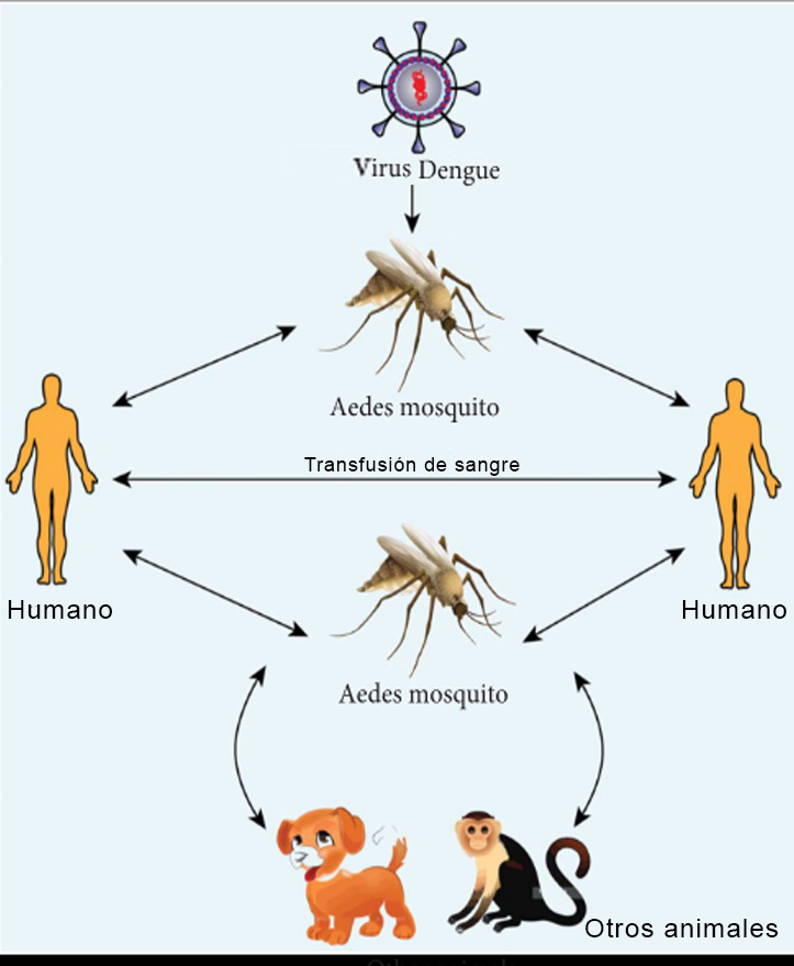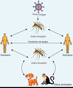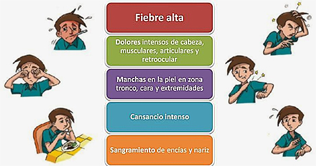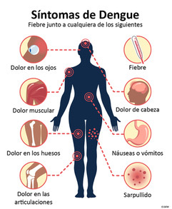 Sus síntomas son variables, se puede tener la infección asintomática o un cuadro sólo con fiebre; o fiebre por dengue con malestar general y dolor generalizado, hasta las formas graves, clasificadas como dengue con signos de alarma y dengue grave con choque y daño severo, que conllevan un riesgo elevado de muerte (dengue hemorrágico).